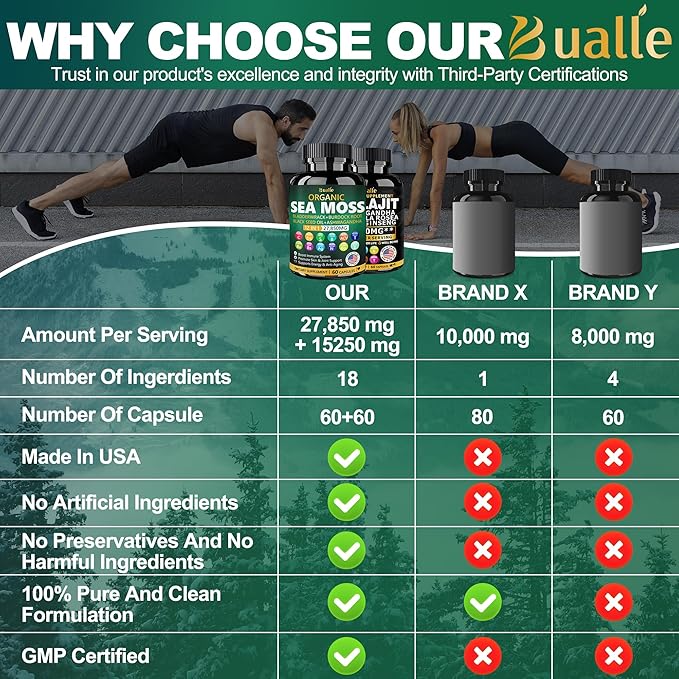 - Organic Sea Moss Capsules:Our Irish sea moss is organic and is a comprehensive combination of Sea Moss Capsules,Black Seed Oil Capsules,Ashwagandha,Bladderwrack and Burdock Root Capsules,enriched with over 12 active ingredients and providing the ultimate in all-round immunity healthy.By adding this supplement to your daily life,you will notice significant improvements