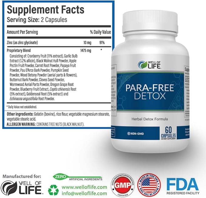 Well of Life para-Free Detox: Immune Support & Natural Detox Blend with Zinc, Black Walnut, Wormwood, Goldenseal, Cranberry & Garlic. Synergistic Formula for Overall Wellness: 60 V Capsules