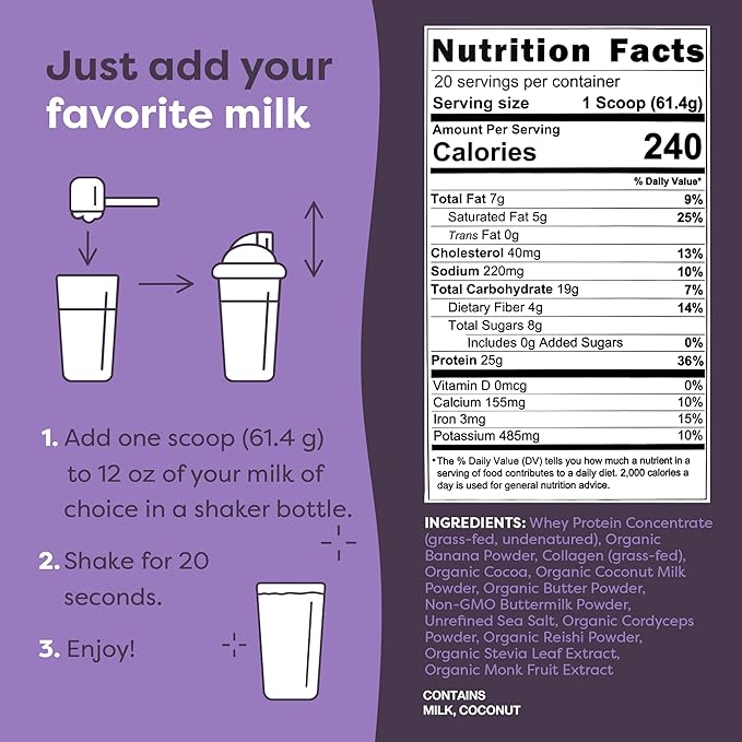 - TOTAL BODY NOURISHMENT: Formulated with non-GMO, minimally processed, and grass-fed, undenatured whey protein, collagen, and added amino acids. Grass-fed bovine collagen peptides (10g per serving) provide extra protein and joint support. Reishi and Cordyceps mushrooms can help increase focus and cognition.