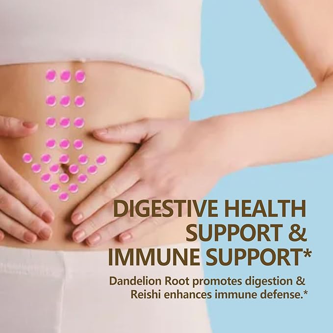 - DIGESTIVE HEALTH SUPPORT & IMMUNE SUPPORT: Our vegan supplement also helps elevate digestive levels and immunity. Dandelion Root traditionally aids digestion and absorption, reducing bloating and heartburn. Combined with Licorice, it supports cell repair and regeneration to safeguard gut health. Additionally, our wellness formula integrated Reishi and Turmeric. They enhance immune balance and natural defense, restoring your body's energy.*