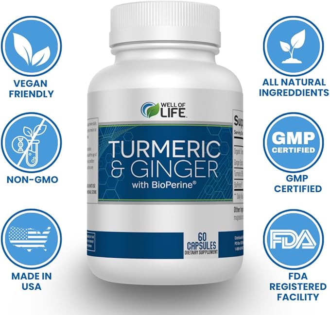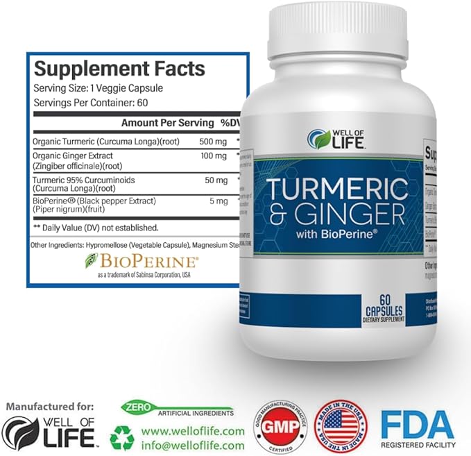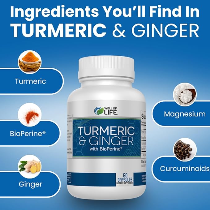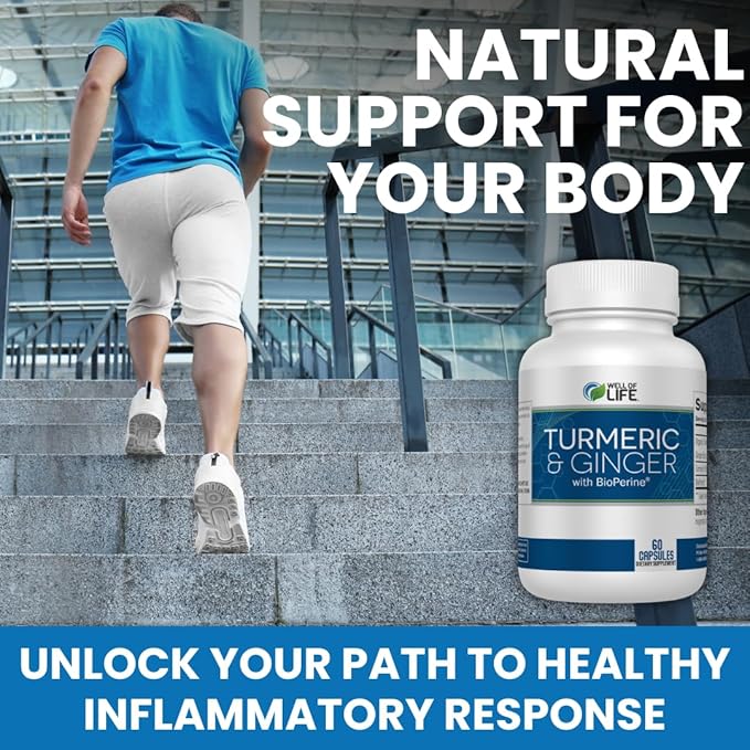 - Powerful Inflammation Support:Combat inflammation and support immune health with Well of Life Turmeric & Ginger. This advanced formula combines the soothing properties of turmeric and ginger with BioPerine to enhance curcumin absorption. Each serving delivers 655mg in 60 vegetarian capsules.