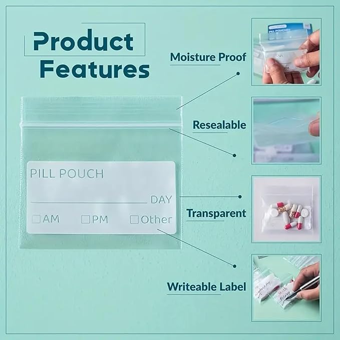 - Medicine Pouch: Ideal for taking your medication on the go. Features write-on label to help you keep track of your medicine. Easily see contents with the clear design