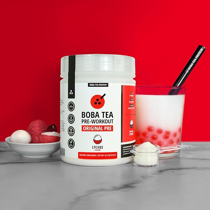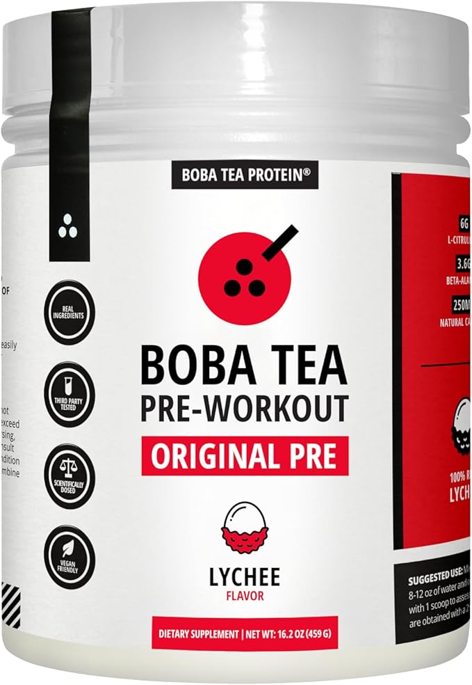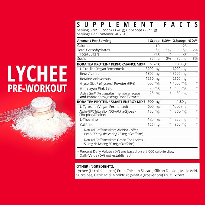 Boba Tea Pre-Workout Powder | Lychee Flavor | 125-250mg Caffeine | L-Citrulline, Beta Alanine, Alpha-GPC | Real Ingredients | Premium Pre Workout Powder for Men and Women | 20-40 Servings