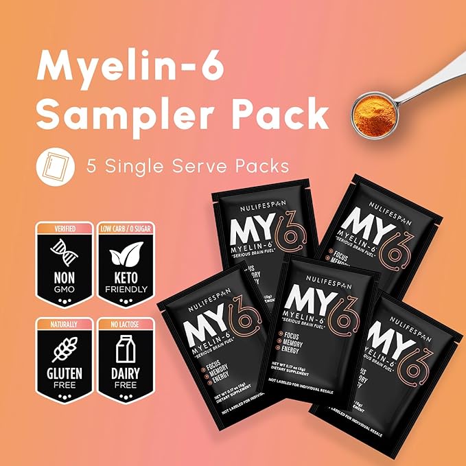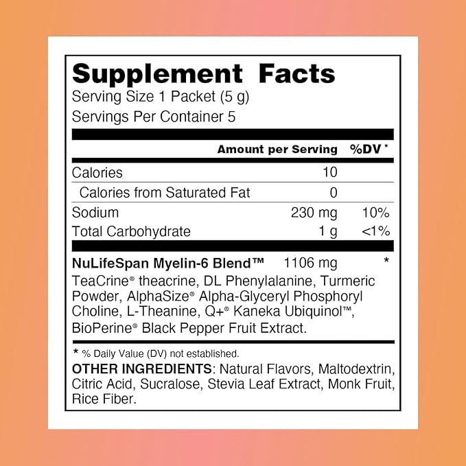 Myelin-6 Sampler Pack, 5 Single Serve Packs, Focus Supplement & Brain Health with AlphaSize, Memory and Cognitive Function Support, Orange Tangerine Flavor, Gluten-Free, Non-GMO