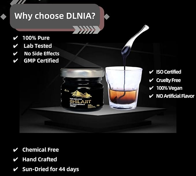 - FEEL THE DIFFERENCE FROM DAY ONE: Join the circle of vitality today! DLNIA promises not just unmatched quality but a commitment to your holistic well-being. Taste the authentic shilajit, additive-free flavor, natural shilajit resin & witness a surge in energy & immune strength, from the very first day. Our Pure Himalayan shilajit supplement is presented in its pure, minimally processed form, free from sugar, heavy metals, fillers, & suitable for vegans.