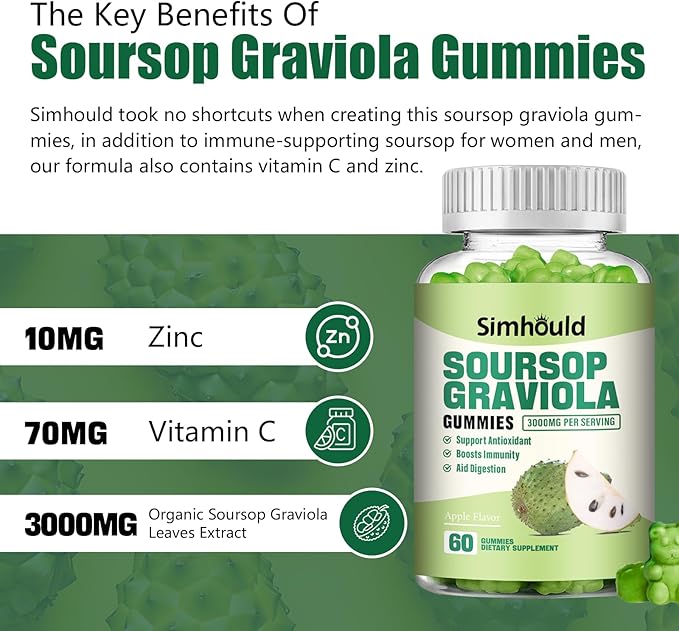 - EXTRA STRENGTH: Simhould took no shortcuts when creating this soursop graviola gummies formula, in addition to immune-supporting soursop for women and men, our formula also contains vitamin C and zinc. A simple, pure combination of ingredients, maximizing the effectiveness and benefits of soursop. The inclusion of Vitamins C and Zinc not only strengthens the immune system but also Supports Immunity, Liver & Digestive, and let you feel the power of health while enjoying delicious food!