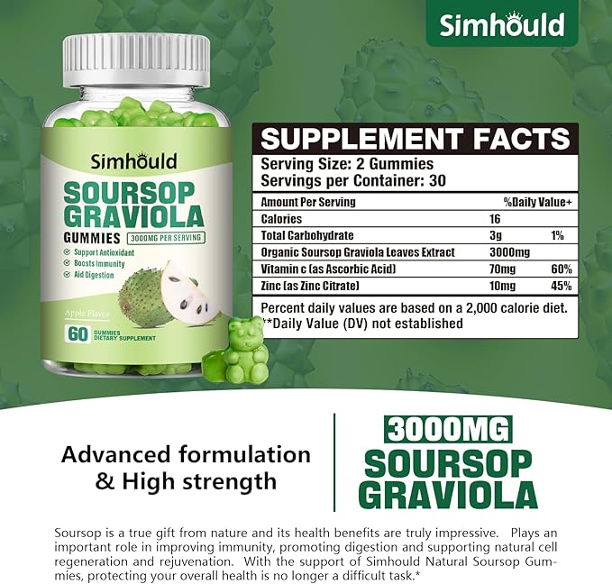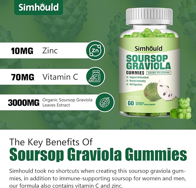 - EXTRA STRENGTH: Simhould took no shortcuts when creating this soursop graviola gummies formula, in addition to immune-supporting soursop for women and men, our formula also contains vitamin C and zinc. A simple, pure combination of ingredients, maximizing the effectiveness and benefits of soursop. The inclusion of Vitamins C and Zinc not only strengthens the immune system but also Supports Immunity, Liver & Digestive, and let you feel the power of health while enjoying delicious food!