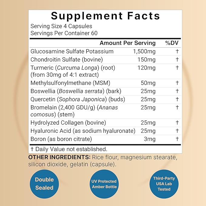 - 240 capsules per bottle, provides a 2-month supply that includes 1,500mg glucosamine with chondroitin, turmeric, MSM, boswellia, quercetin, bromelain, hydrolyzed collagen, hyaluronic acid, and boron.