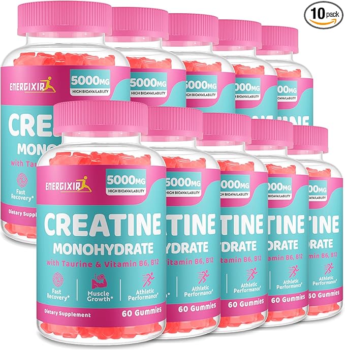- Premium Ingredients: Each bottle of Energixir creatine monohydrate gummies contains 60 gummies, providing a generous supply for your fitness goals. 5000 mg per serving creatine monohydrate gummies made in a GMP-certified facility with non-GMO ingredients. We designed these gummies to appeal to any and everyone, they're the perfect addition to your training routine