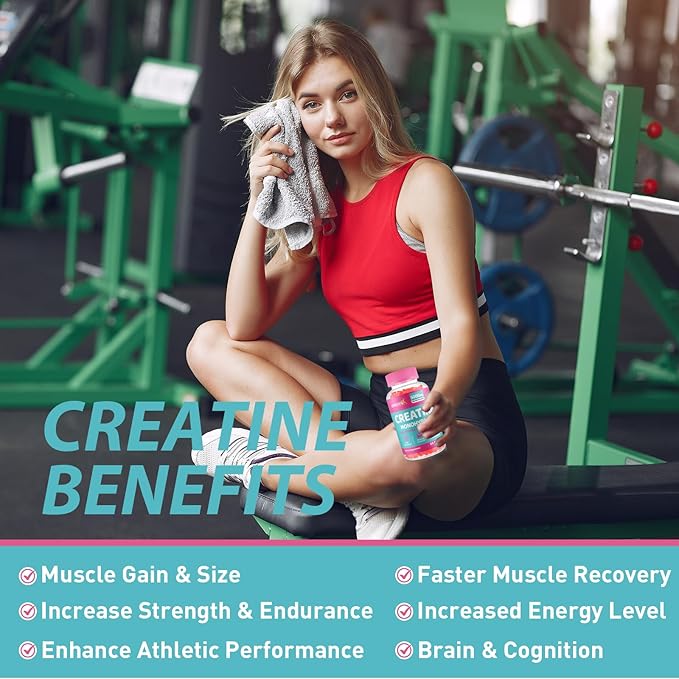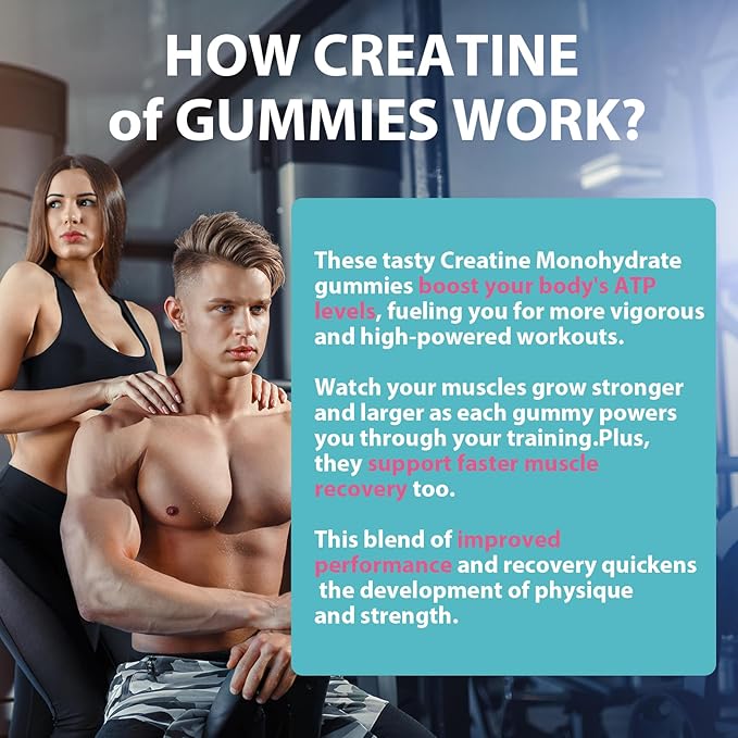 - Chewable Gummies For Men And Women: Creatine monohydrate gummies offer a delightful and convenient way to reap the benefits of creatine supplementation. Whether you're an athlete looking for your physical performance, or simply someone striving to optimize their overall vitality, our creatine monohydrate gummies for women provide a trusted and delectable solution for harnessing the power of creatine monohydrate