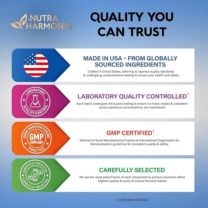 - Trustworthy Service — At NUTRAHARMONY, we are committed to providing only premium-quality supplements, including our carefully crafted sleep support capsules. With our natural sleep aids for adults, you can trust that you’re receiving a scientifically formulated supplement designed to aid better sleep & relaxation. Our exceptional customer service ensures that your satisfaction is our top priority, making your wellness journey as seamless and trustworthy as possible.