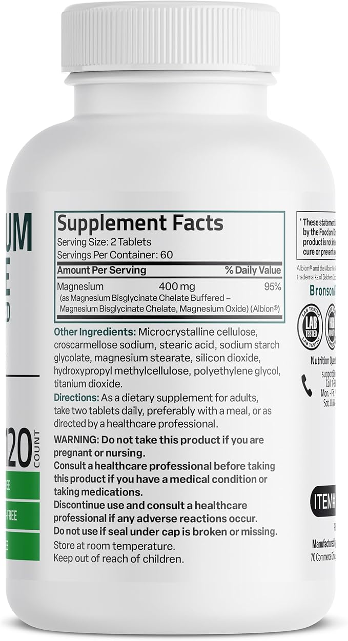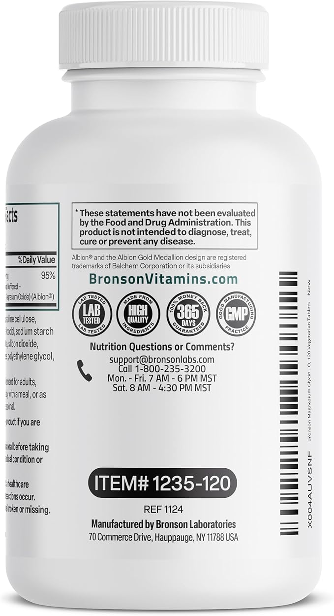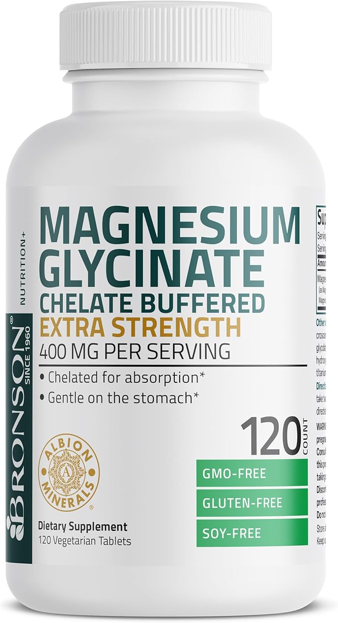 Bronson Magnesium Glycinate 400mg Extra Strength, Vegetarian, Chelated for Absorption Gentle on The Stomach, Non-GMO, 120 Tablets