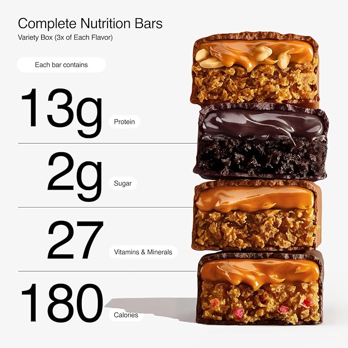 - COMPLETE NUTRITION BARS: A nutritionally complete bar wrapped in a vegan cocoa coating with a smooth caramel layer. High in protein and fiber, with all 27 essential vitamins and minerals, our brand new bars are the perfect snack to satisfy your sweet tooth and fuel your body with quality nutrition.