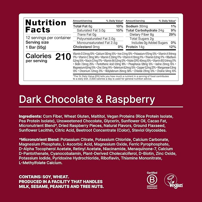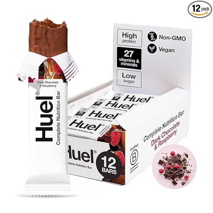 Huel Complete Nutrition Vegan Protein Bars | Dark Chocolate Raspberry | 13g Protein, 27 Vitamins and Minerals, 2g Sugar, Non-GMO, 100% Plant Based Snack | 12 Pack