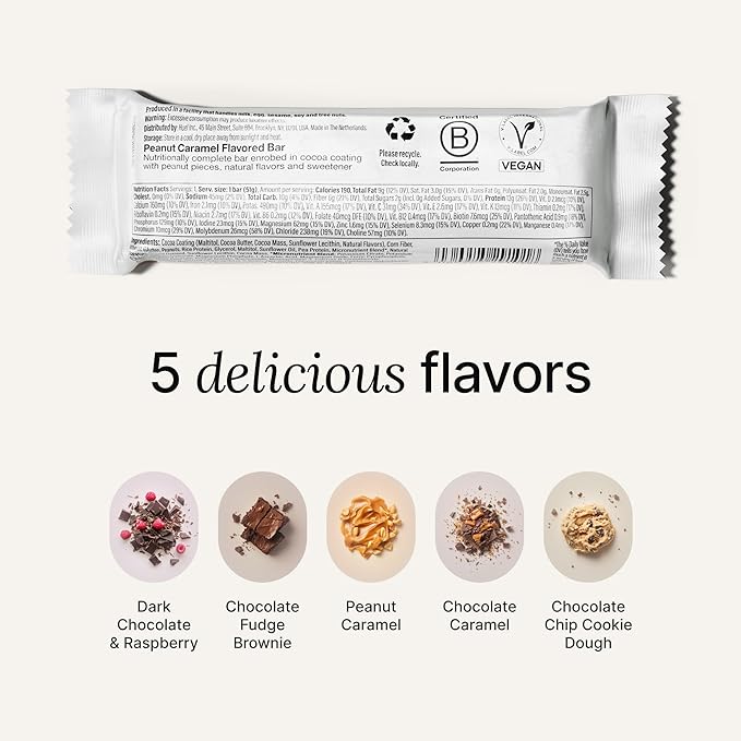 - COMPLETE NUTRITION BARS: A nutritionally complete bar wrapped in a vegan cocoa coating with a smooth caramel layer. High in protein and fiber, with all 27 essential vitamins and minerals, our brand new bars are the perfect snack to satisfy your sweet tooth and fuel your body with quality nutrition.