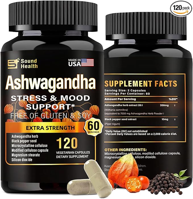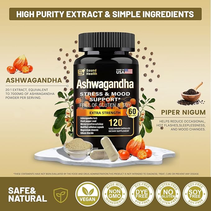 - SIMPLE INGREDIENTS>>> Soundhealth Ashwagandha extra strength contain premium ashwagandha and black pepper extract sourced from pristine environments, free from artificial flavors, colors, and preservatives. Manufactured with rigorous quality standards to ensure purity and safety.