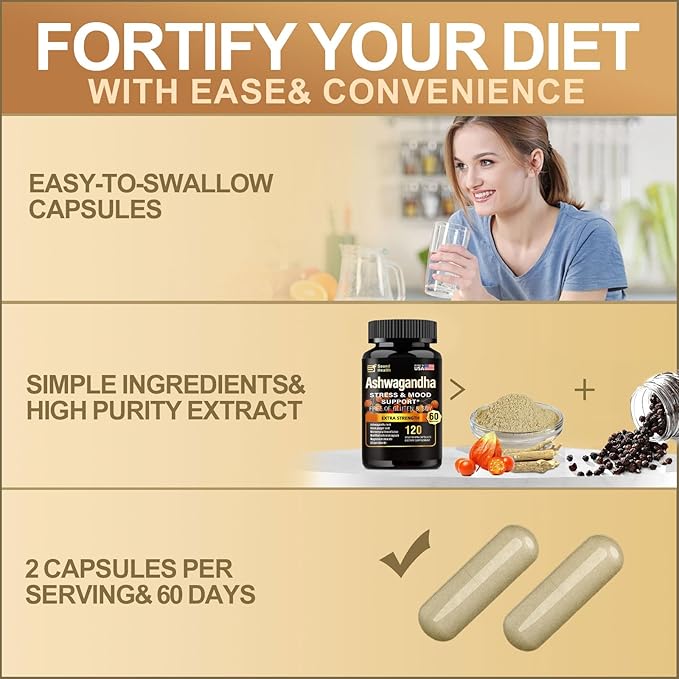 - CONVENIENT AND RELIABLE>>> Each bottle contains 120 capsules for easy portability and consumption, allowing you to enjoy the benefits of ashwagandha anytime, anywhere—at home, the office, or on-the-go. Our team is dedicated to delivering exceptional customer service for a stress-free shopping experience.