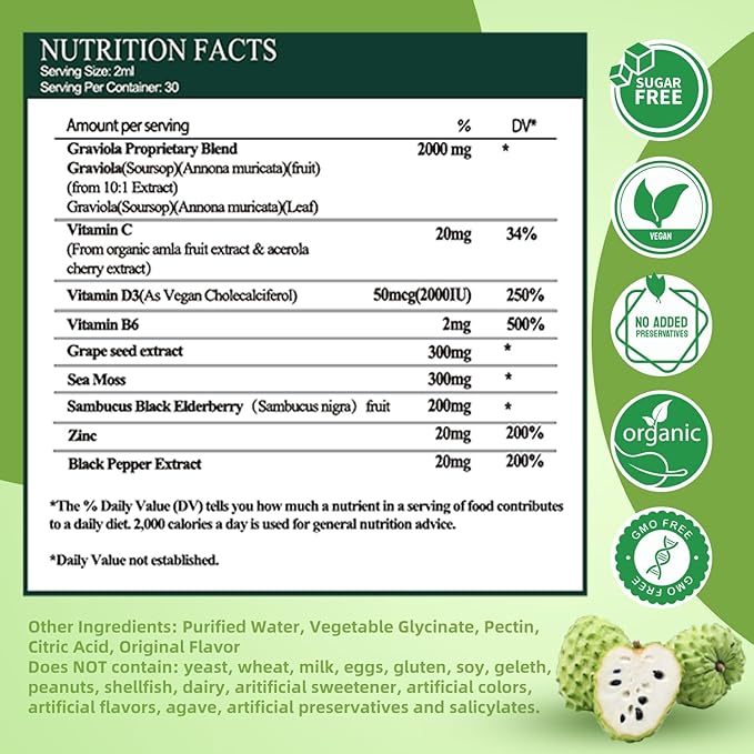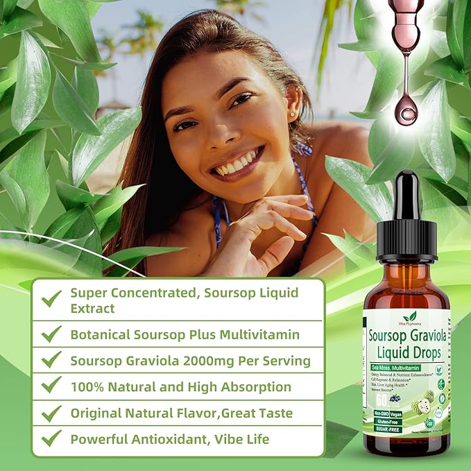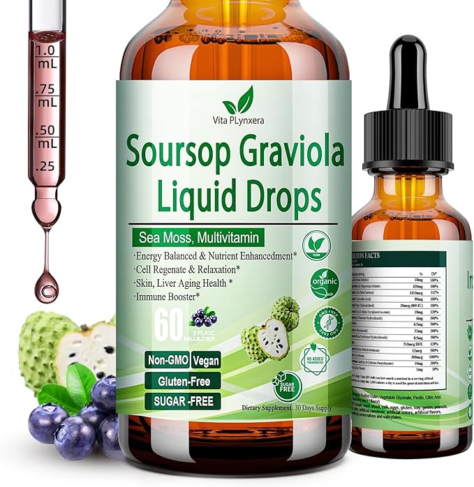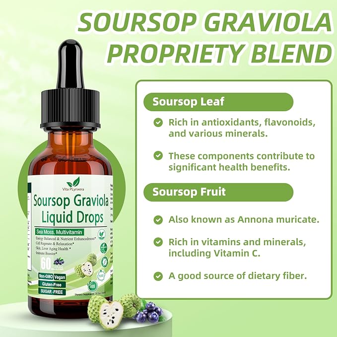 - 【POWERHOUSE SOURSOP MULTIVITAMIN AND HERBS COMBO】The Vita PLynxera Soursop Graviola liquid drops feature a high potency formula that expertly combines 10 powerful ingredients:Our wildcrafted Soursop guanabana herbal raw, sea moss,grape seed extract, sambucus elderberry, ginger, vitamins C D3 B6, black pepper, and zinc all of ingredients are beneficial for immune health, antioxidant, digestion aid and energy levels. This super concentrated soursop multivitamin and herbs blend maximizes the benefits of each ingredient, allowing you to conveniently and cost-effectively enhance your overall health with just 2ml daily dose—ideal for both men and women.