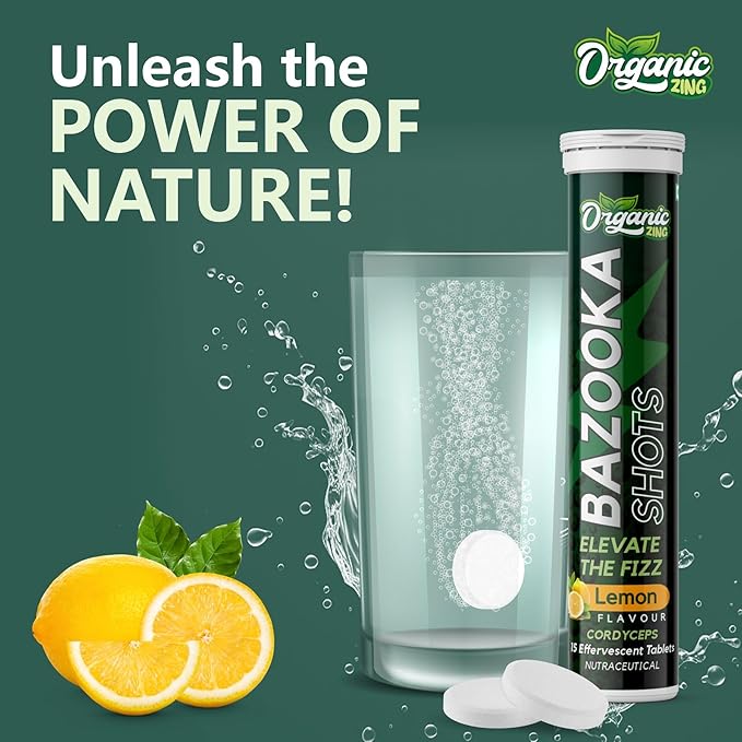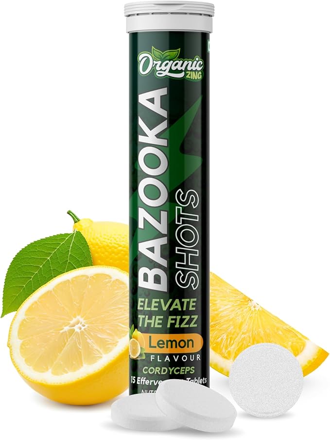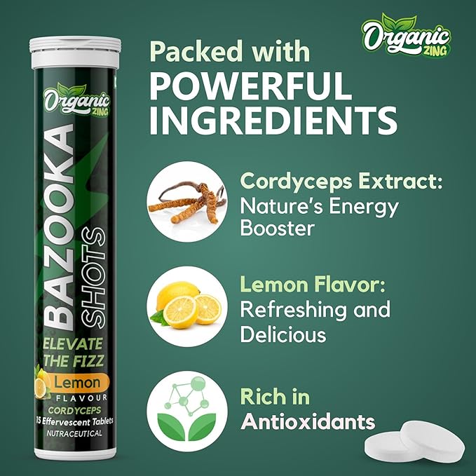 Bazooka Energy Effervescent Tablets - Energy Boost, Pre-Workout, No Crash, & Boost Immunity with Cordyceps Extract - Lemon Flavor, 15 Tablets