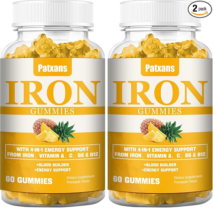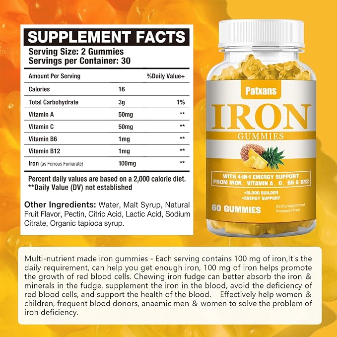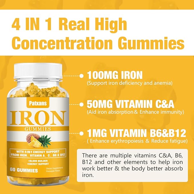 - Why Choose Patxans : Each Patxans iron gummies contains 50mg vitamin A, 50mg vitamin C,1mg vitamin B6, 1mg vitamin B12,100mg Iron, are an easy to take gummy suitable for women, men & children, adult. Patxans supplements gummies are gluten-free, gelatine-free. And it's pectin-based. You can incorporate them into your daily life.