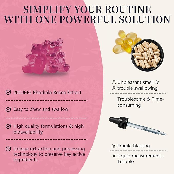 - In terms of relaxing the body and mind, increasing endurance, improving work performance, building tolerance to high altitudes, treating symptoms such as fatigue, weakness - Rhodiola Rosea is a powerful & popular adaptogen known as "golden root" or "arctic root". in traditional medicine in Europe & Asia, our gummies contain 2000mg Rhodiola Rosea extract, Make sure you get an effective daily dose of this traditional herb. Helps your body manage stress & good mindset and physical endurance.