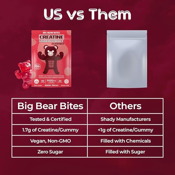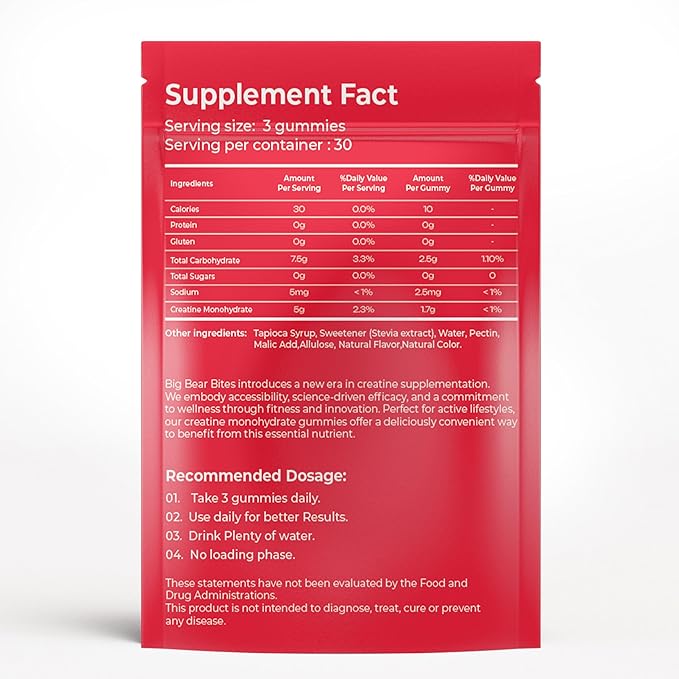- ๐๐ผ๐ป๐๐ฒ๐ป๐ถ๐ฒ๐ป๐ ๐๐ฎ๐ถ๐น๐ ๐๐ผ๐๐ฒ ๐๐ถ๐๐ต ๐๐ ๐๐๐บ๐บ๐ถ๐ฒ๐ ๐ฝ๐ฒ๐ฟ ๐๐ฎ๐ด: Each bag of Big Bear Bites creatine monohydrate gummies contains 90 delicious pre workout gummies, providing a full 30 servings. Simply take 3 gummies a day to meet your daily creatine needs, making it easy to incorporate into your routine without the need for measuring creatine monohydrate powders or swallowing creatine pills.