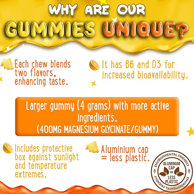 - Gentle and Effective Magnesium Support for All Ages: Each magnesium glycinate gummy delivers 400mg of magnesium glycinate with vitamin B6 & D3, offering enhanced absorption to support muscle health, relaxation, and restful sleep for the whole family.