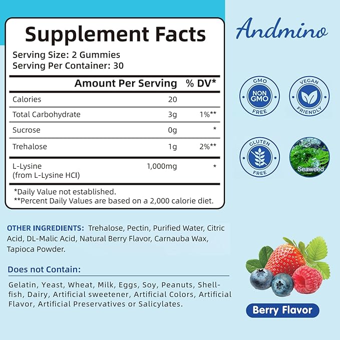 L-Lysine Gummies 1000 mg, with Trehalose, L Lysine Gummies for Lips & Oral Health, Boost Immune & Collagen & Calcium, for Adults & Kids, Non-GMO, Vegan, Gluten Free, Berry Flavor, 60