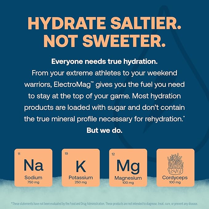 - TRUE DIFFERENCE - ElectroMag is crafted with intention using carefully sourced ingredients. Contains 750 mg sodium, 1390 mg chloride, 250 mg potassium & 100 mg magnesium for essential minerals; 100 mg fruiting body cordyceps mushroom for endurance.