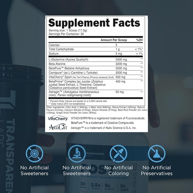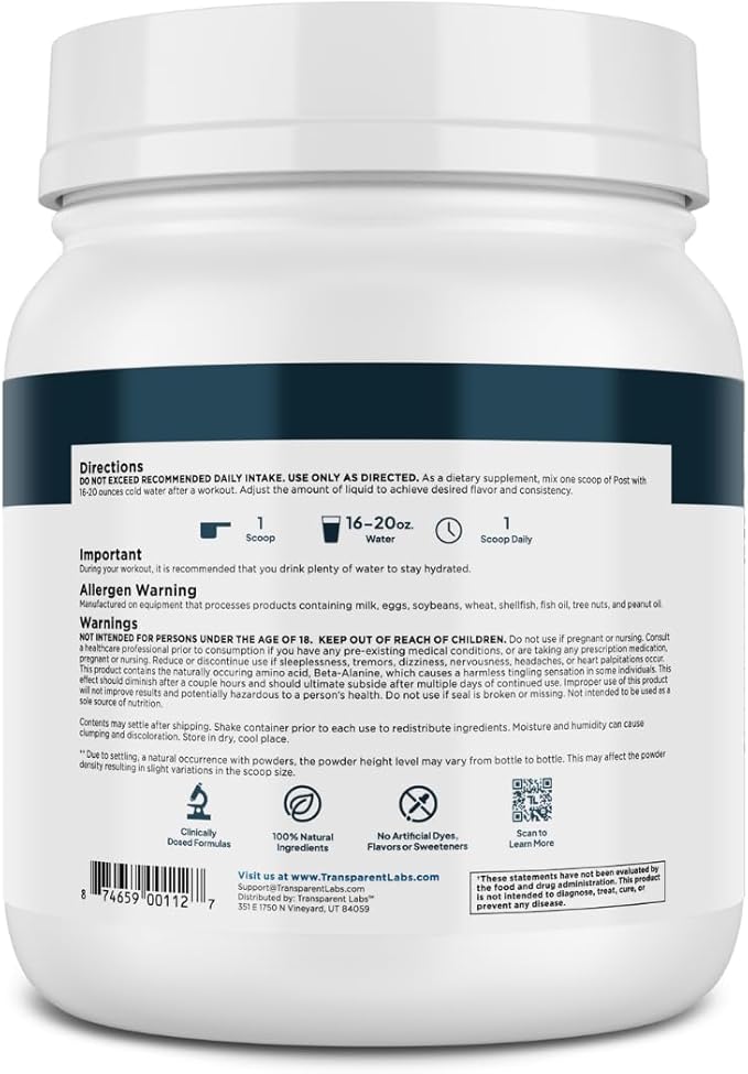 - Maximize Muscle Recovery and Reduce Soreness: Transparent Labs Post features clinically dosed ingredients like VitaCherry, BetaPure, L-Glutamine, and BetaPrime to support muscle recovery and minimize soreness after intense workouts.