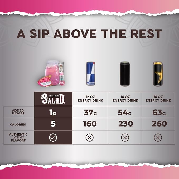 - US vs THEM - Unlike traditional energy drinks loaded with sugars, Salud will turn plain water into a mouth-watering Agua Fresca drink with only 1g of added sugar and 5 calories per serving. You can feel good about starting your mornings and workouts with Salud!