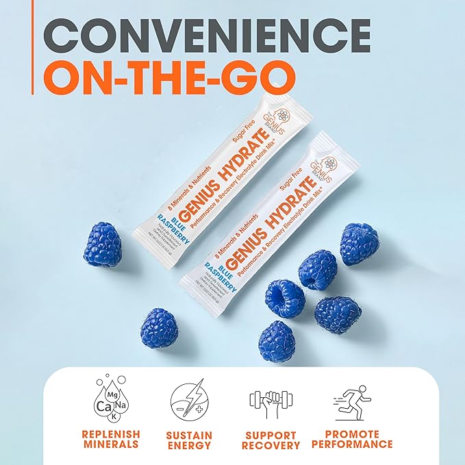 - Delicious & Convenient Electrolyte Boost: Enjoy a tasty way to replenish your essential electrolytes with Genius Hydrate Stick Pack Powder Drink Mix! This hydration powerhouse easily fits into your daily routine, making it a convenient go-to for athletes, fitness enthusiasts, and anyone looking to stay hydrated throughout the day