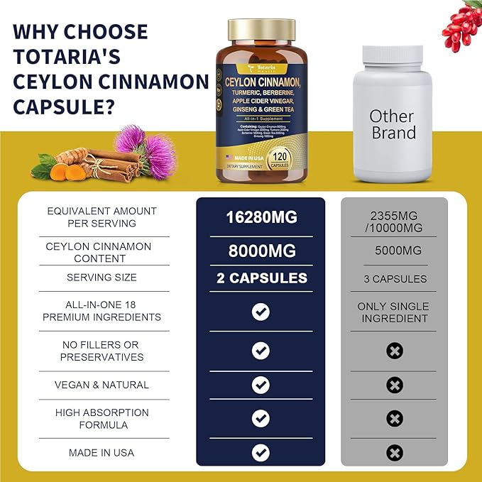 - ๐ Premium Customer Service: We provide the best customer service. Ensuring your satisfaction is our highest priority. If, for any reason, you are not happy with Totaria organic cinnamon Capsules, just let us know at any time. We offer a 3-month warranty. If our product falls short of your expectations, please contact us directly for a prompt solution.