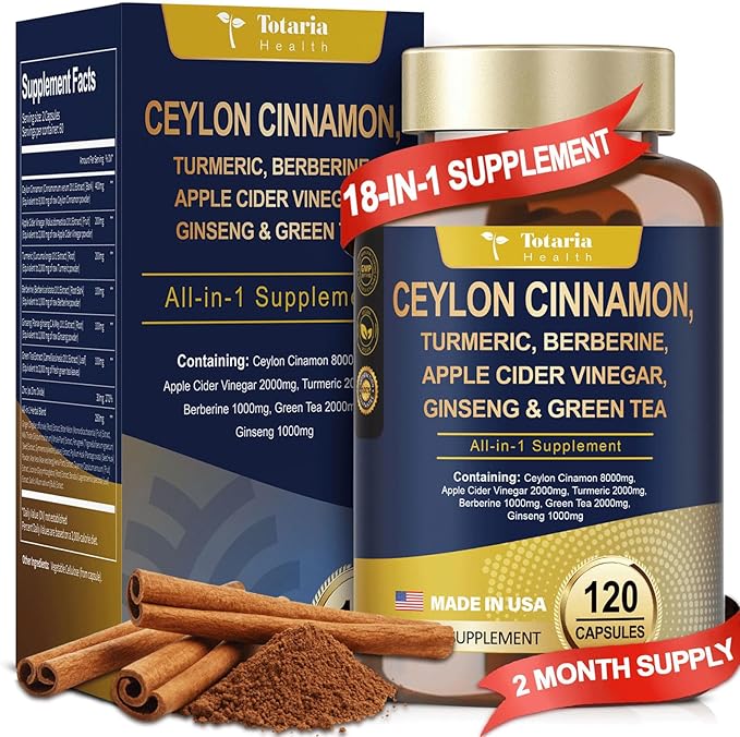 18-in-1 Ceylon Cinnamon 8000mg, Made in USA, 2000mg Apple Cider Vinegar 2000mg Turmeric 1000mg Berberine 1000mg Ginseng Plus Bitter Melon for Gut, Metabolism & Heart, 120 Vegan Capsules