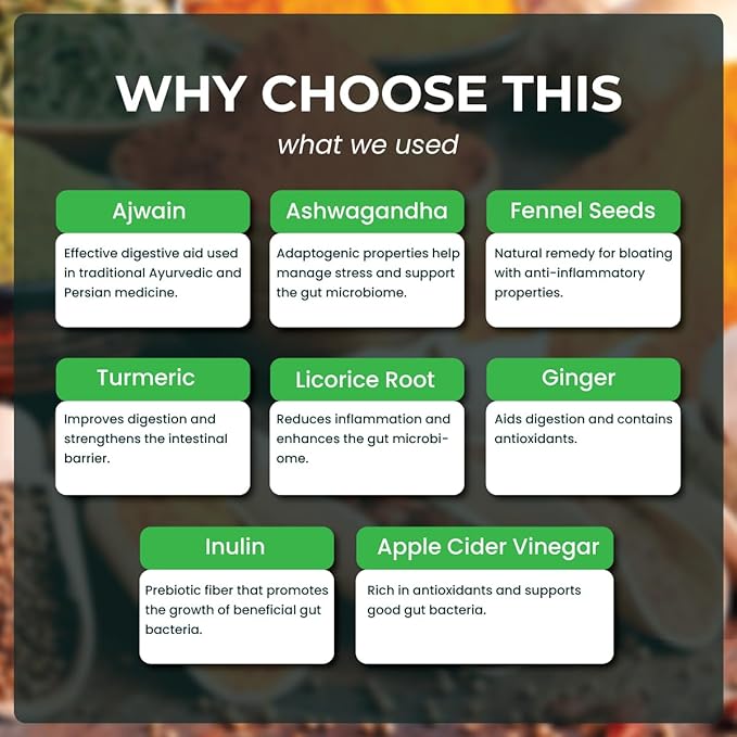 - Natural Ingredients: Formulated with ajwain (carom seeds), turmeric, ginger, fennel, moderate dosage of ashwagandha, prebiotics, and probiotics to support gut health, relieve bloating, reduce gas, and maintain a healthy microbiome. Contains 2 billion CFU of multiple probiotic strains and inulin to nourish gut bacteria and promote gut wellness.