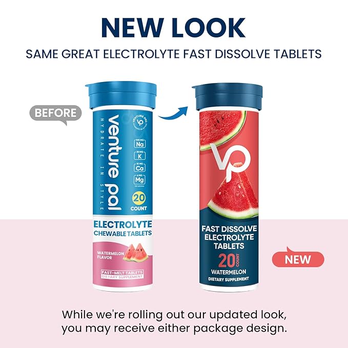 - VENTURE PAL ELECTROLYTE CHEWABLE TABLETS: Introducing our newest innovation, the Chewable Bite-sized Fast-Melt Electrolyte Tablets that take effect almost immediately. Rich in essential electrolytes - sodium, magnesium, potassium, and calcium - they replenish vital electrolytes lost through sweating, helping to maintain hydration during daily exercise and endurance training, reduce heat stress, and alleviate leg cramps