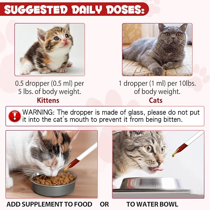 - Usage & Notes - The cat supplies with the glass dropper and you can apply to cat's food 2 times per day. Kittens with 0.5 dropper (0.5 ml) per 5 lbs. of body weight. Cats with 1 dropper (1 ml) per 10lbs. of body weight. Note: Because the iron supplement can interact with other medications, always consult your vet before supplementing your cat's diet with iron.