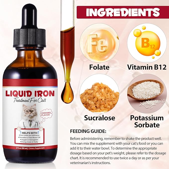 - Energy levels & Vitality - The liquid iron dirops works by increasing hemoglobin levels, and transporting and utilizing oxygen to cells of the body. It may also assists cats healthy, increases energy, and enhances athletic performance.
