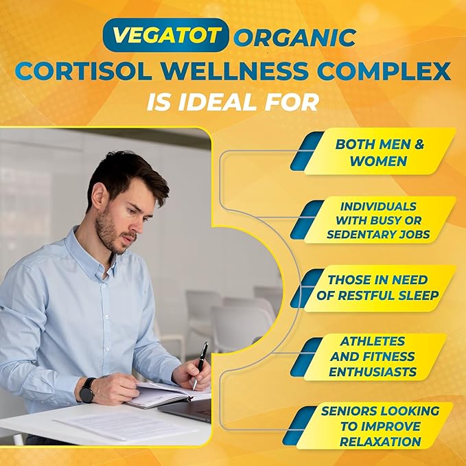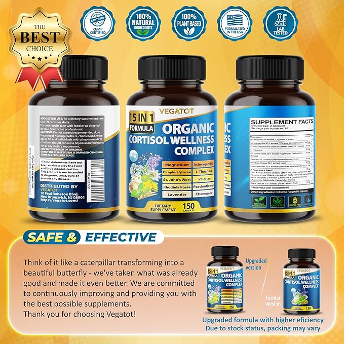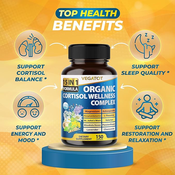 VEGATOT Organic Cortisol Wellness Complex 15-in-1 Formula with Magnesium Ashwagandha St. John's Wort Valerian Rhodiola Rosea Passionflower Chamomile