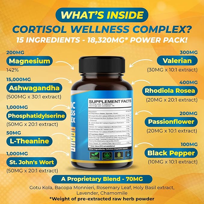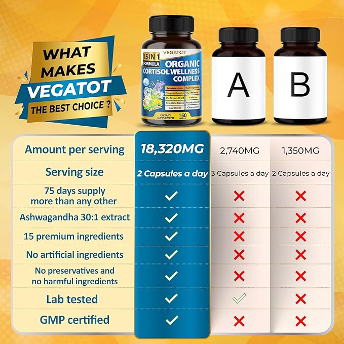 - Peak Power: Vegatot Cortisol Wellness delivers a total dose of 18,320 mg per serving, incorporating fifteen premium ingredients for optimal strength