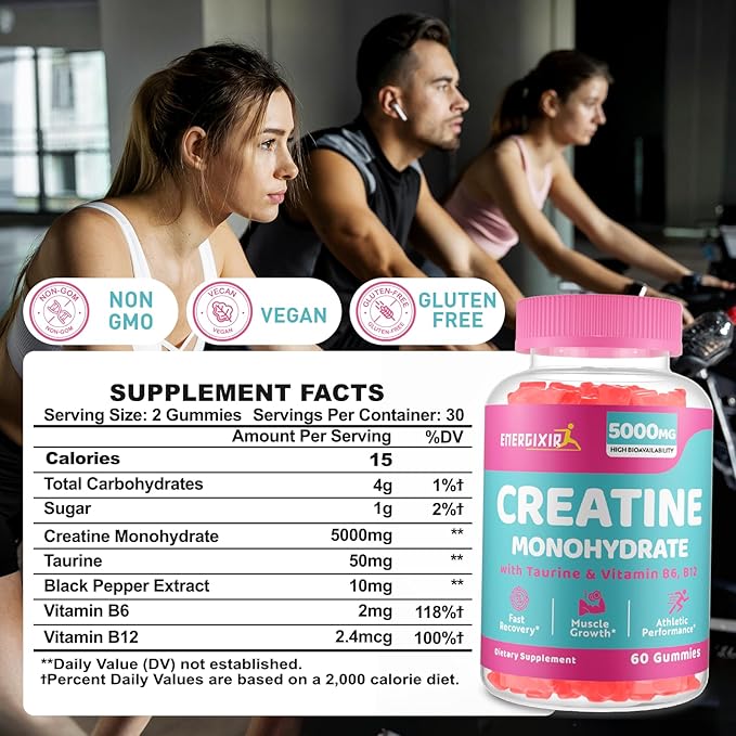 - Premium Ingredients: Each bottle of Energixir creatine for women contains 60 gummies, providing a generous supply for your fitness goals. 5000 mg per serving creatine for women made in a GMP-certified facility with non-GMO ingredients. We designed these gummies to appeal to any and everyone, they're the perfect addition to your training routine