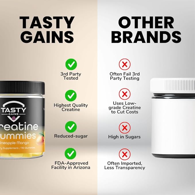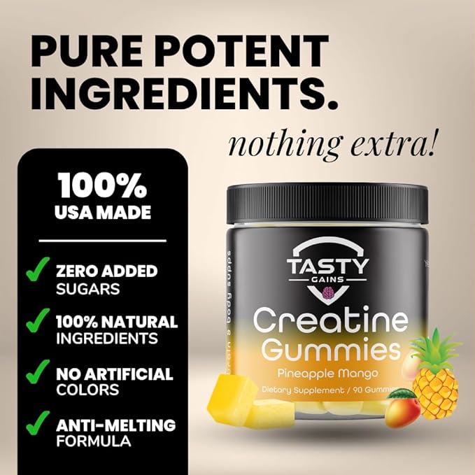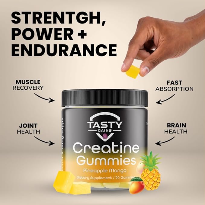 Creatine Infused Gummies, 90g of Creatine, Non-GMO, Vegan - Build Muscle & Boost Strength for Men & Women (1g Creatine Monohydrate Per Gummy) Made in USA (Large, Pineapple Mango)