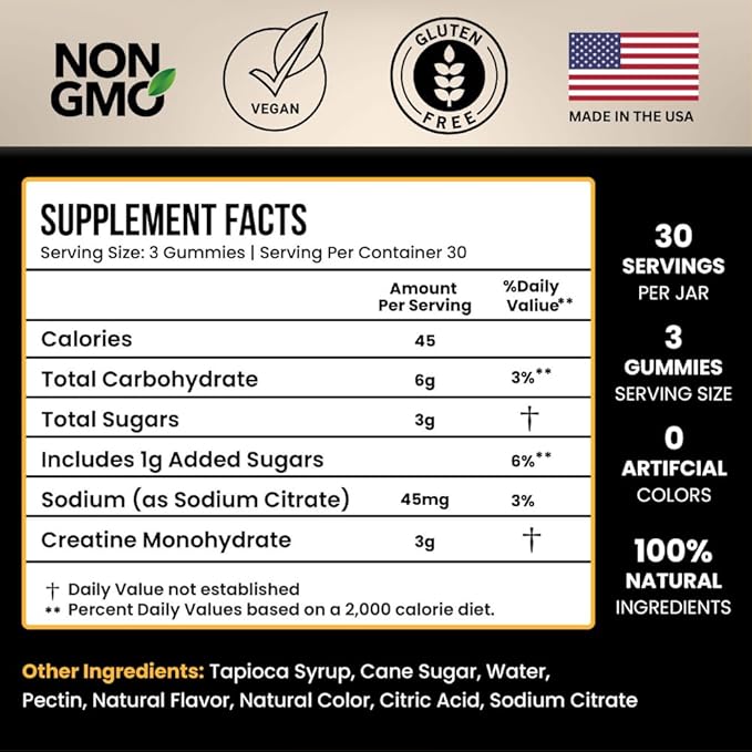 - Unlock Muscle Definition with our premium Creatine Monohydrate Gummies. The #1 gym supplement for those looking to build muscle & get fit. Each gummy delivers a potent 1g of pure creatine monohydrate, packed into a delicious treat that's as enjoyable as it is effective.