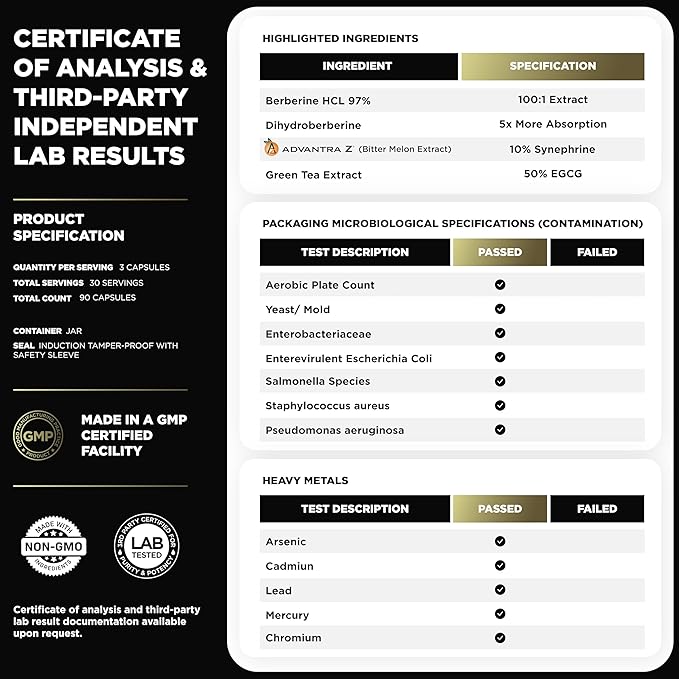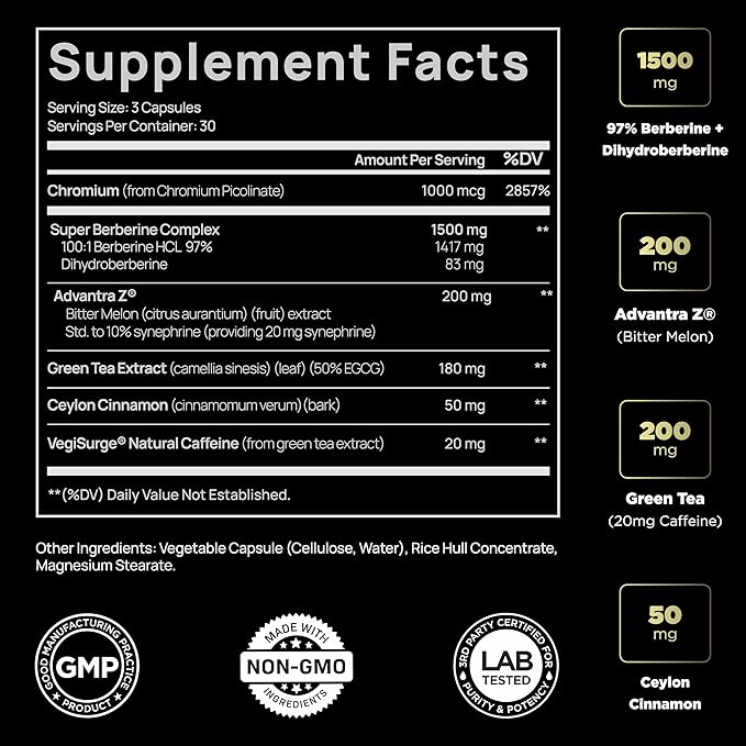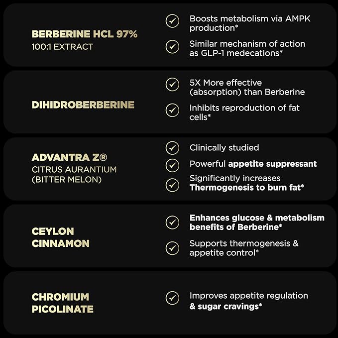 - Primary Supplement Type : Berberine, Green Tea Extract, Ceylon Cinnamon, Dihydroberberine, Synephrine