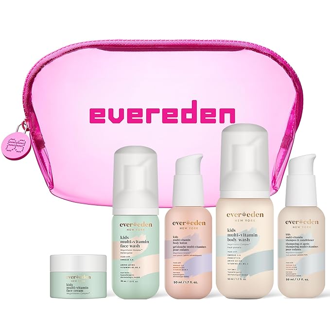 Evereden Kids Travel Set: Clean & Vegan 5-Piece Skin Care Set for Kids | Multi-Vitamin Kids Skin Care Set w/t Body Wash, Lotion, Face Wash, Cream, Shampoo & Conditioner | TSA approved