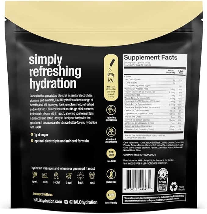 - RICH IN VITAMINS - One advanced hydration HALO powder stick contains Vitamin C and Zinc. HALO also contains vitamins B1, B3, B6, B9, and B12 and no artificial sweeteners or GMOs.