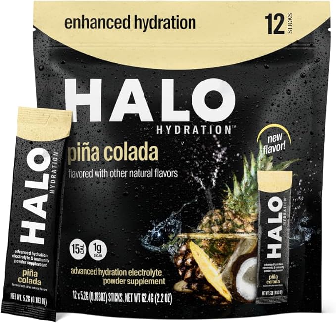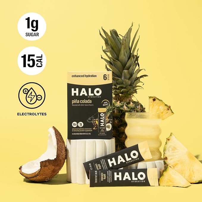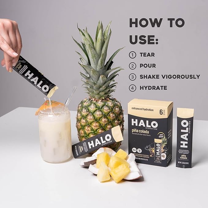 Halo Hydration - Electrolyte Drink Mix | Hydration Powder Packets | Pina Colada Flavor – for Sports and Cycling | Easy Open Single Serving Stick | 12 Sticks