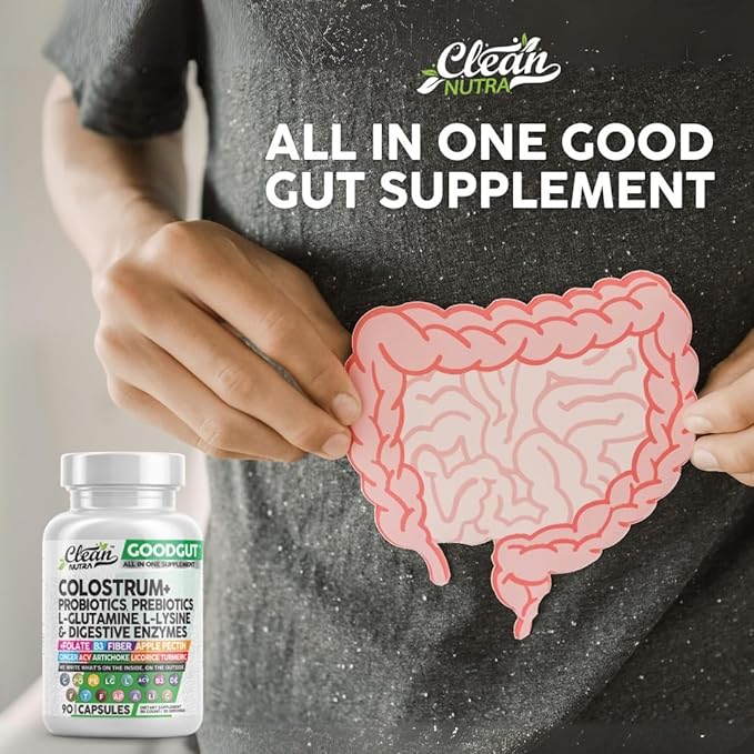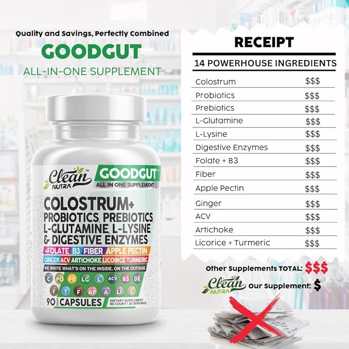 Colostrum Supplement Capsules Probiotics Pills Prebiotics, L-Glutamine, Digestive Enzymes, Folate, Fiber, ACV, Turmeric, Apple Pectin and Turmeric Clean Nutra Good Gut