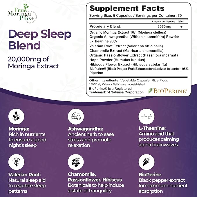 - A Symphony of Sleep-Supportive Botanicals: True Moringa Plus+ incorporates a powerful blend of natural ingredients that work together in harmony including Ashwagandha, Valerian Root, Chamomile, Passionflower, and Hibiscus. These botanicals are known for their adaptogenic, relaxation, and properties to help induce a state of tranquility before sleep.
