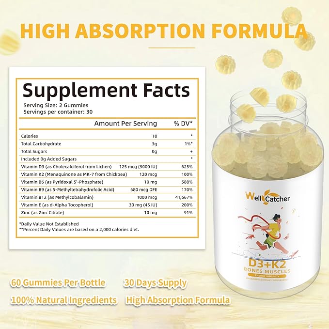 - HEALTHY FORMULA: Our gummies are packed with goodness! They contain vitamins B6, B9, B12, E and zinc, as well as highly absorbable vitamin D3 5000 IU and vitamin K2 (MK-7) 120 mcg. Calcification is when the body absorbs calcium but deposits it in other parts of the body instead of the bones. But don't worry! Our K2 D3 vitamin supplement helps the body to better direct and absorb calcium into the bones